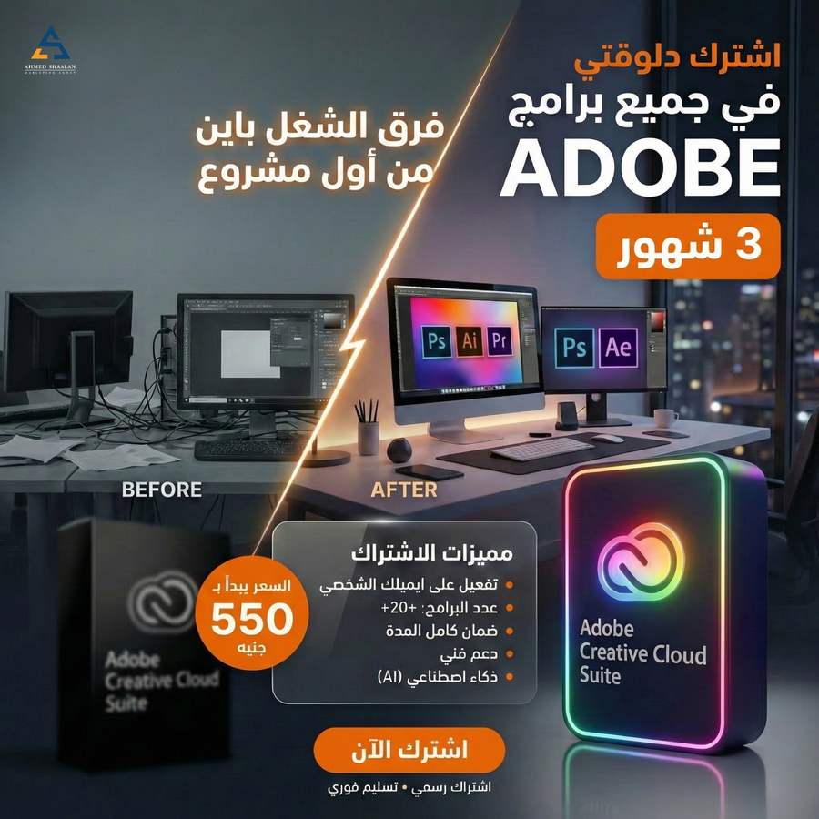 - يشمل أكثر من 20 برنامج: Photoshop / Illustrator / Premiere / After Effects / Lightroom …